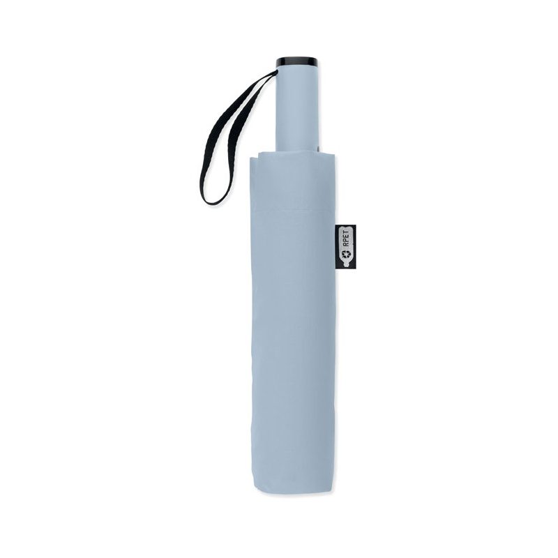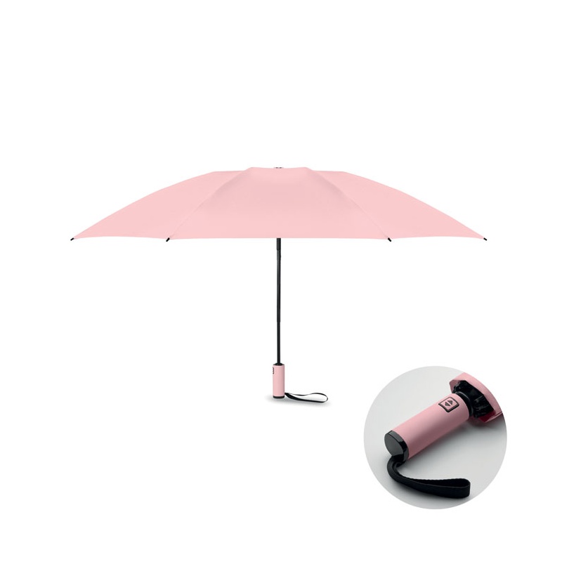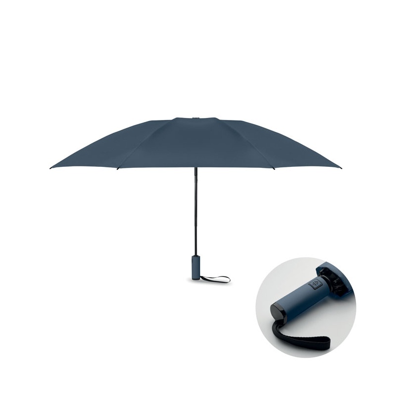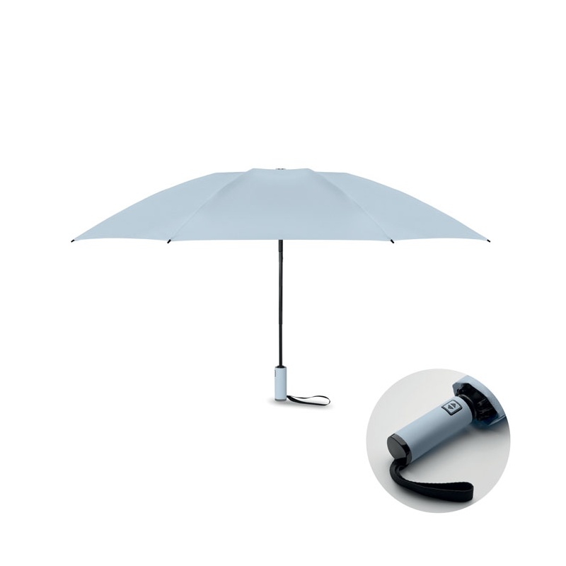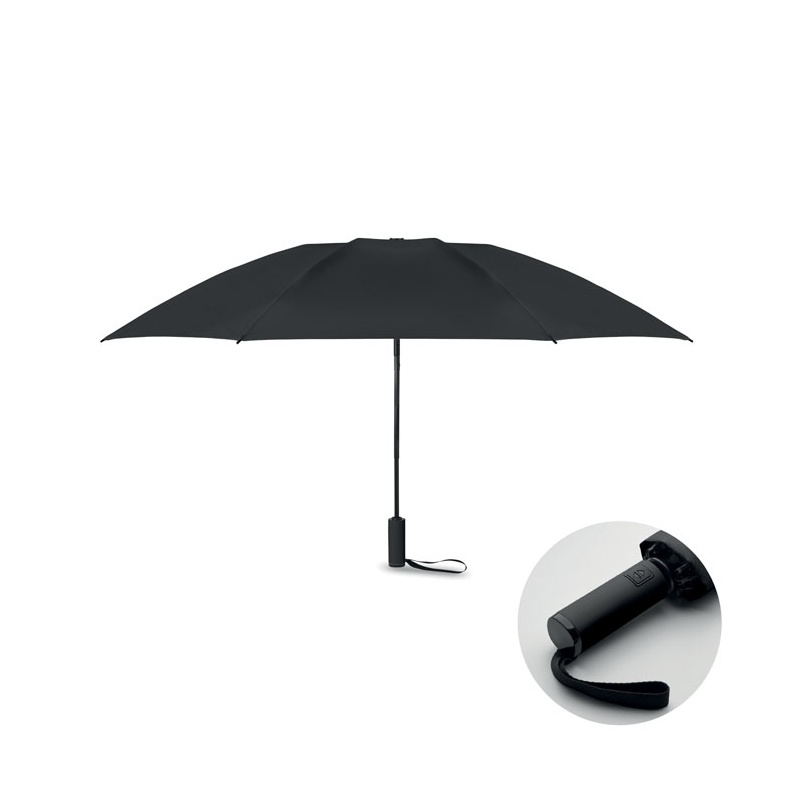 23-inch 3-fold reverse windproof umbrella made of 190T RPET pongee and matching pouch. Auto open and close, full black plating frame, fibreglass ribs, and a rubber-finished ABS handle.