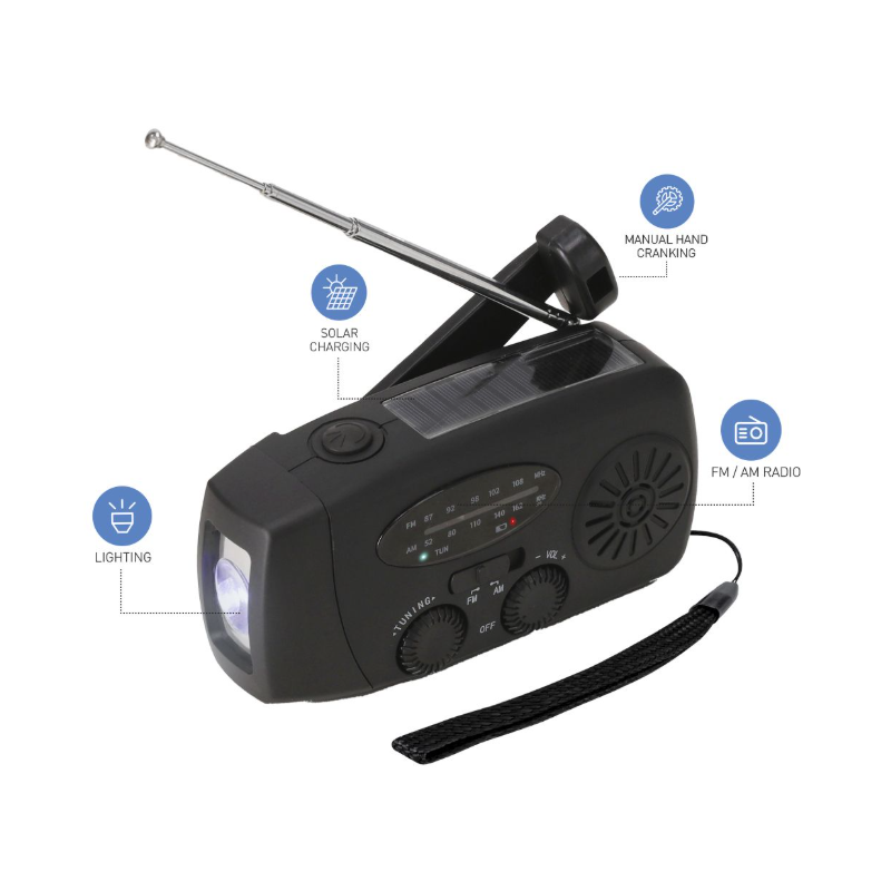 Vastupidav FM/AM raadio, LED-taskulamp, SOS-režiim, päikesepaneel ja käsilaadija.